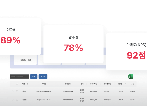 기업 교육생의 평균 진도율/수료율/만족도 척도를 실시간으로 파악할 수 있고, 해당 데이터를 엑셀 파일로 한 번에 다운로드할 수 있습니다.
