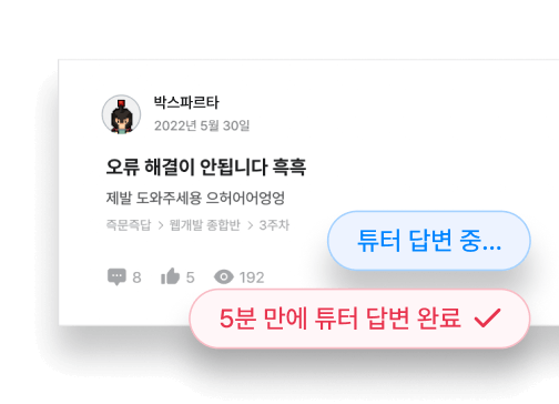즉문즉답 게시판을 통해 튜터님께 직접 질문할 수 있습니다. 5분내로 답변해드려요.