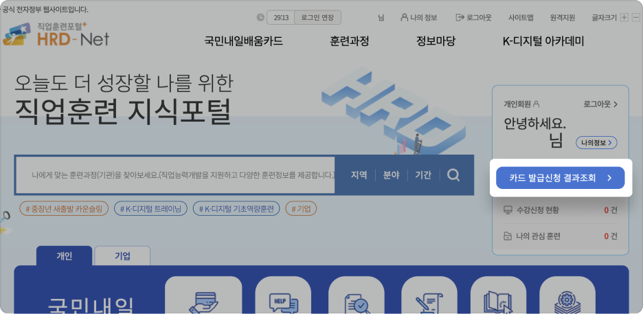 2. 메인페이지에서 카드 발급신청 결과조회 버튼을 클릭하세요.
